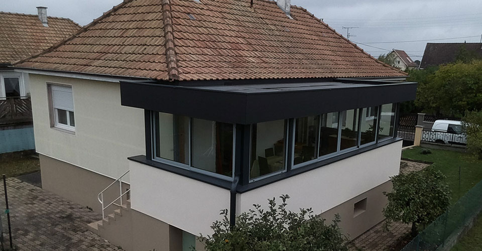 Les extensions de maison peuvent aussi nécessiter la mise en place d’un toit plat. Pour diverses raisons, de cohérence avec le reste du bâtiment comme de vision d’architecte spécifique, le toit plat peut être une option, que les Vérandas de l’Est sont en mesure de proposer parmi tous nos services. Ainsi, nous menons à bien votre projet de rénovation de maison au travers d’une construction d’extension mobilisant toute l’expertise de nos professionnels. En effet, le choix d’un toit plat nécessite une étude spécifique pour assurer le bon maintien de l’ossature de l’extension, tout en permettant un bon écoulement des eaux de pluie.